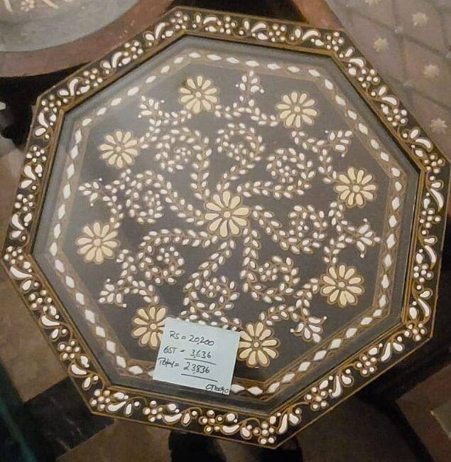 🪑 Design: Intricate floral inlay on an elegant octagonal surface, bordered with pearl-toned accents