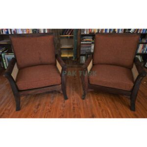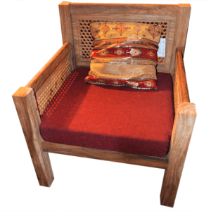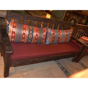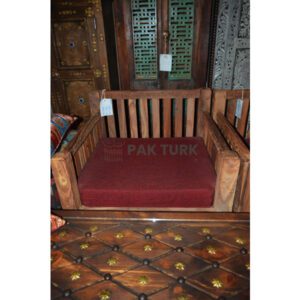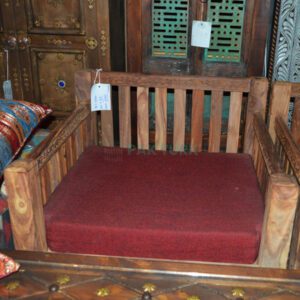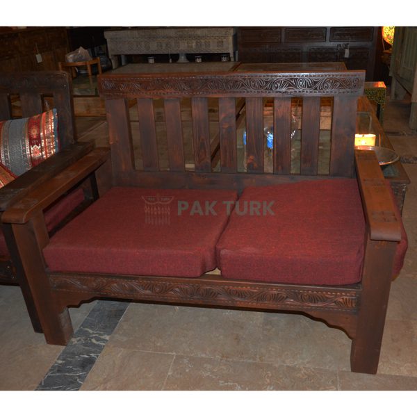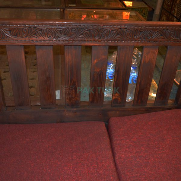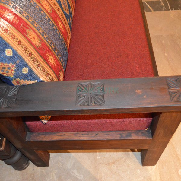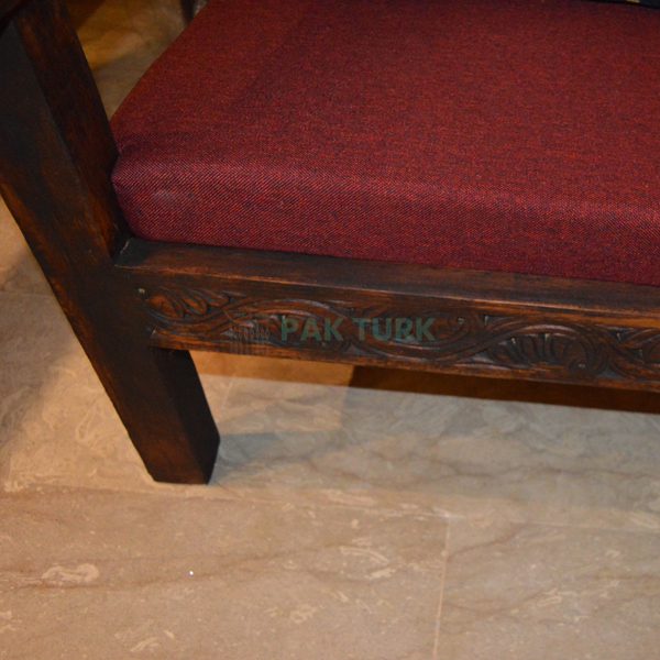 🛋️ Features deep maroon cushions offering comfort and a rich contrast against the dark wood frame