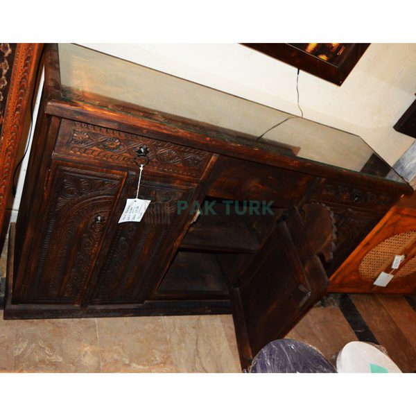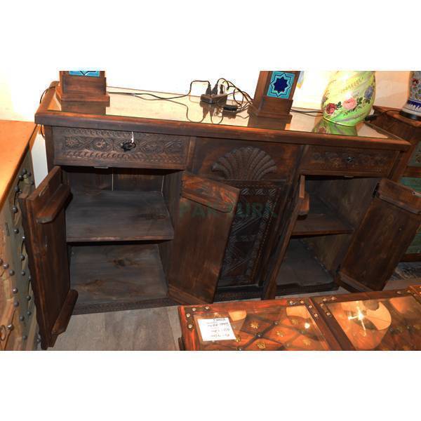 🖌️ Design: Intricately carved with floral and geometric patterns across doors and drawer fronts