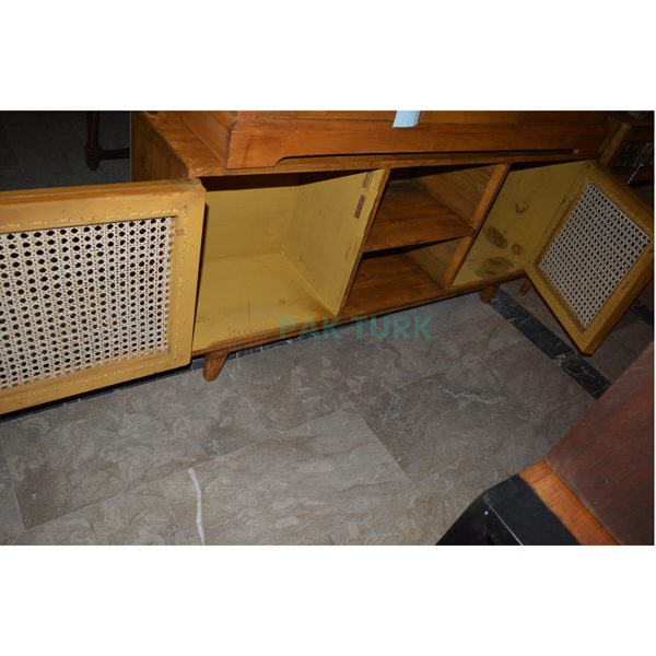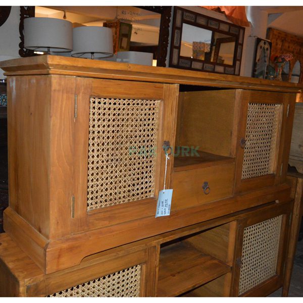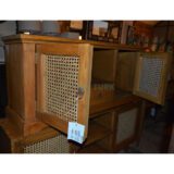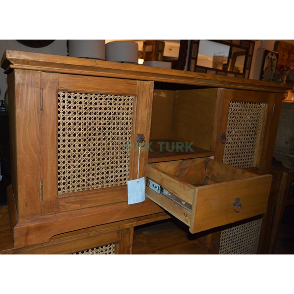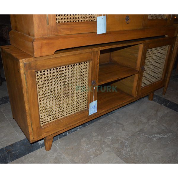 🧺 Features cane-paneled cabinet doors for breathable storage and a light, textured look