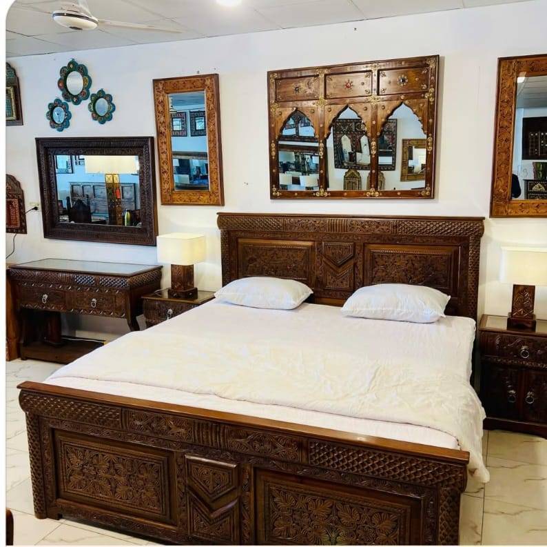 Design: Traditional craftsmanship with intricate floral and geometric carvings on the headboard and footboard
