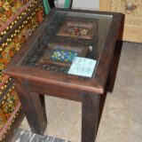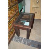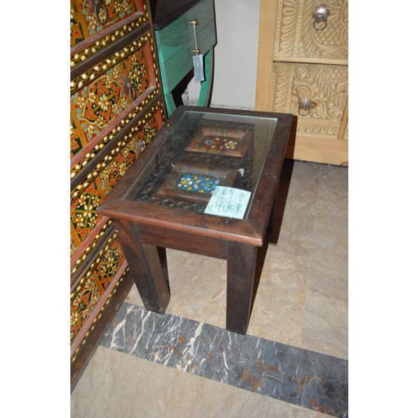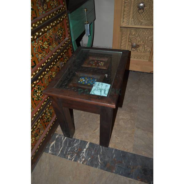 🎨 Color: Rich brown wood with multicolor painted tile inlays and transparent glass top