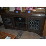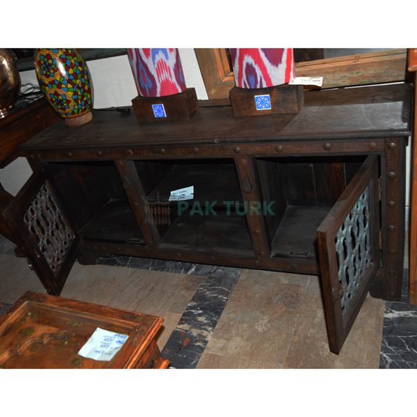 🚪 Three-door design with decorative metal grills on cabinet fronts