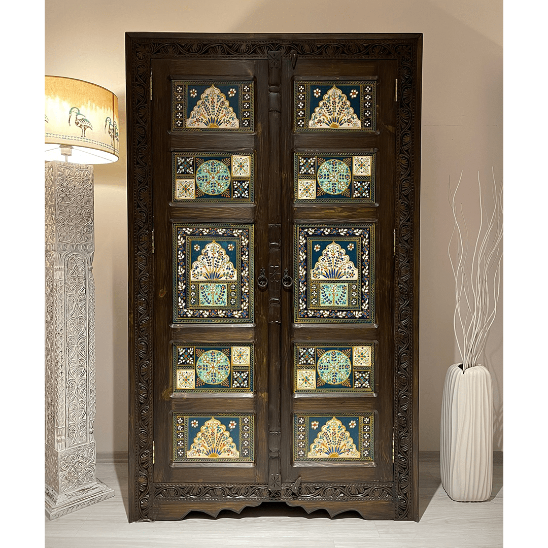 Design: Hand-painted geometric and floral motifs on wooden panels, adding a vibrant, traditional aesthetic.