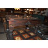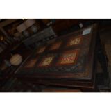 🖌️ Design: Inset hand-painted tile panels beneath a glass top, arranged in a symmetrical grid