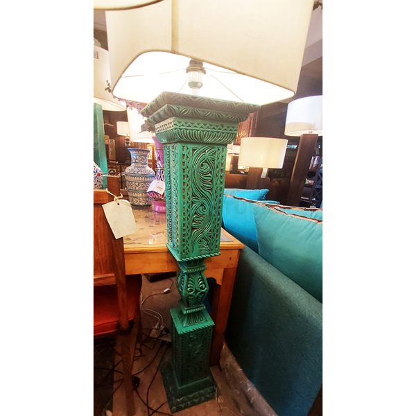 🟩 Design: Bold pillar structure with intricate lattice and floral carvings, finished in antique turquoise