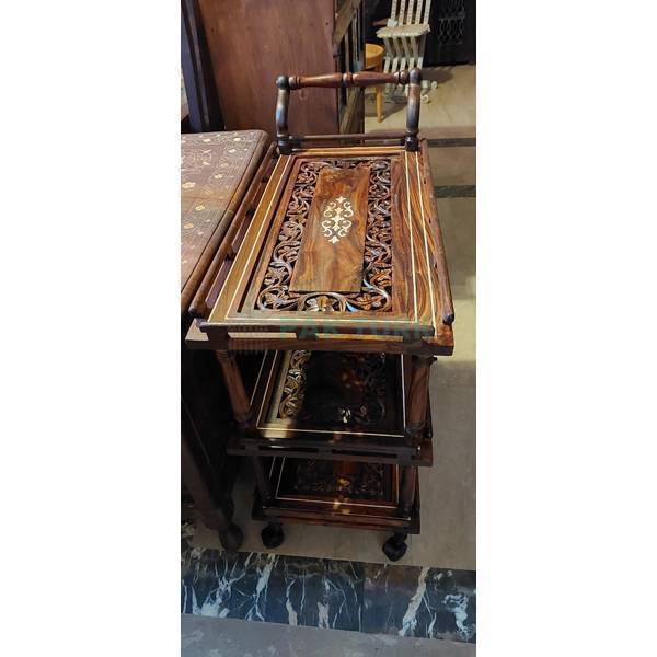🚥 Design: Traditional tiered trolley with detailed carving on all trays and vintage-style wheels