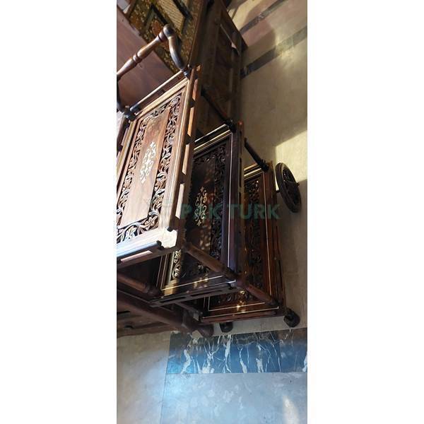 🪵 Material: Solid wood frame with turned pillars and hand-carved shelf surfaces