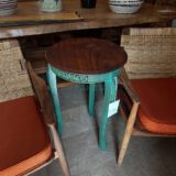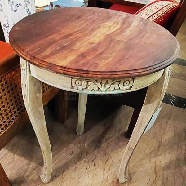 🎨 Design: Classic round tabletop paired with intricately carved vintage legs