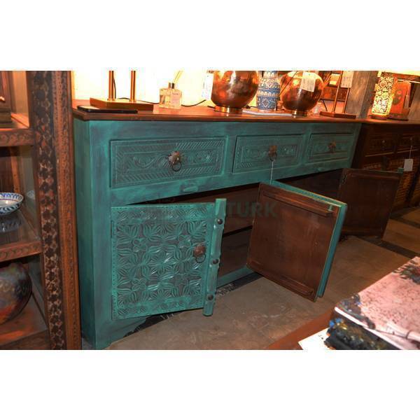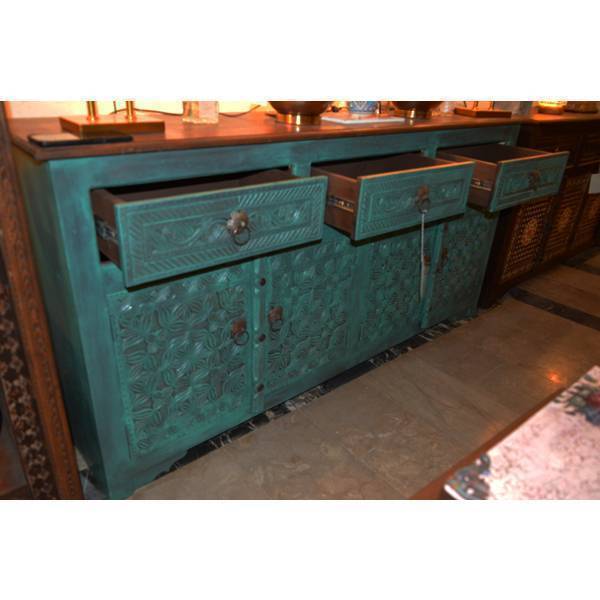 🖌️ Design: Deep floral and vine carvings on the cabinet doors with textured drawer panels